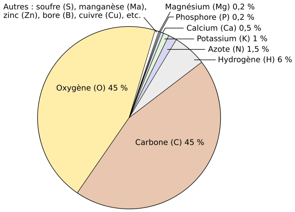 Les plantes, comme tous les organismes vivants, sont faites de matière organique[1]. Quatre éléments dominent cette composition : carbone (C), hydrogène (H), oxygène (O) et azote (N). En plus petites proportions, on trouve aussi le phosphore (P) et le soufre (S). D’autres, tels que le potassium (K) ou le calcium (Ca), n’entrent pas dans la structure organique des plantes mais jouent un rôle clé sous forme d’ions pour assurer l’équilibre cellulaire. Et puis, il y a ces métaux comme le magnésium (Mg) ou le fer (Fe), sans lesquels la fabrication de pigments et d’enzymes serait impossible. Chacun de ces éléments, une fois assimilé par le vivant, prend le statut de nutriment.